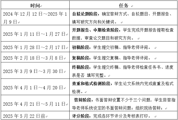 4)学生应按论文写作进度及指导老师要求完成论文各环节任务,凡在2025年1月11日前未与指导教师联系过的学生,视为自动放弃论文写作,指导教师可不再进行指导。