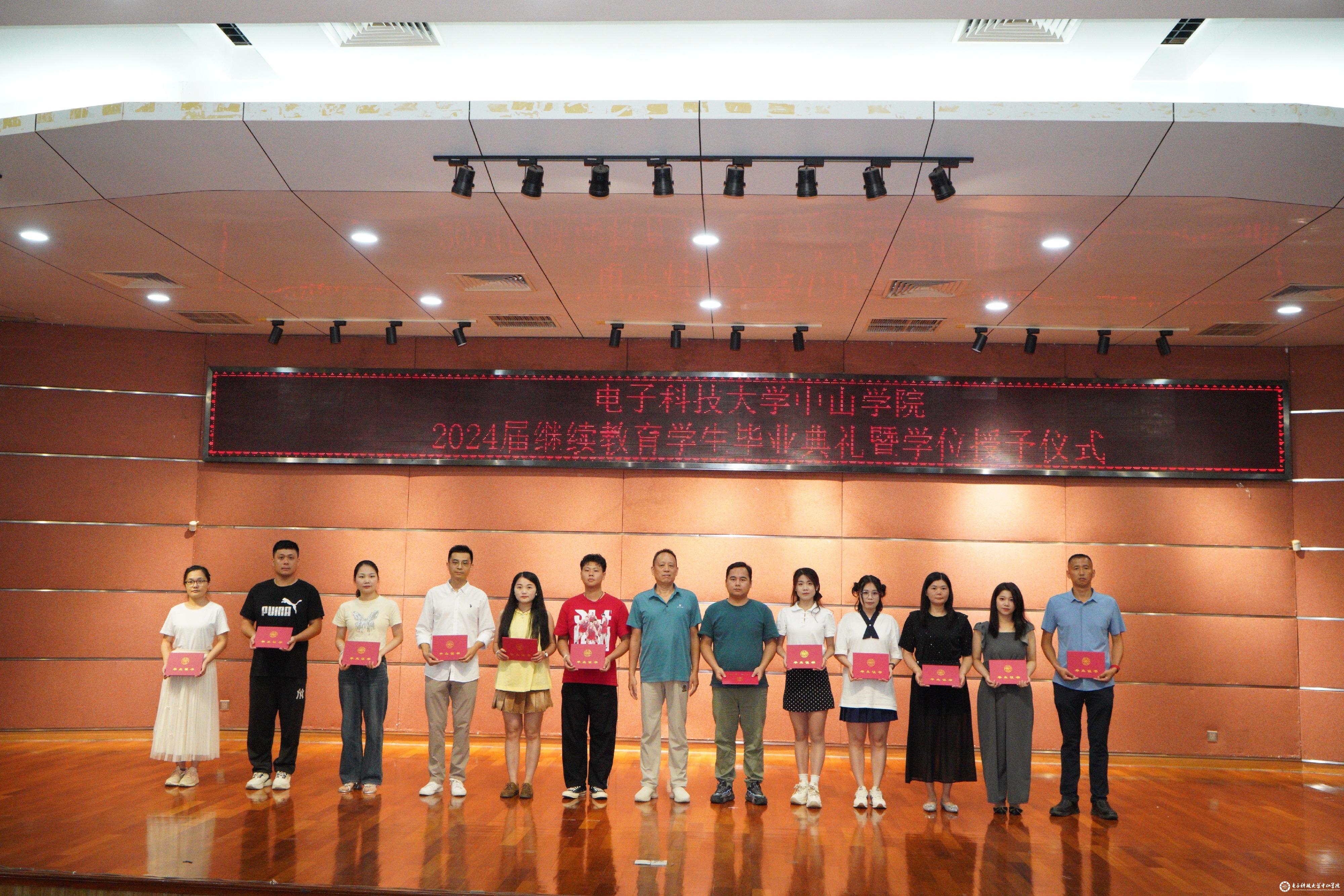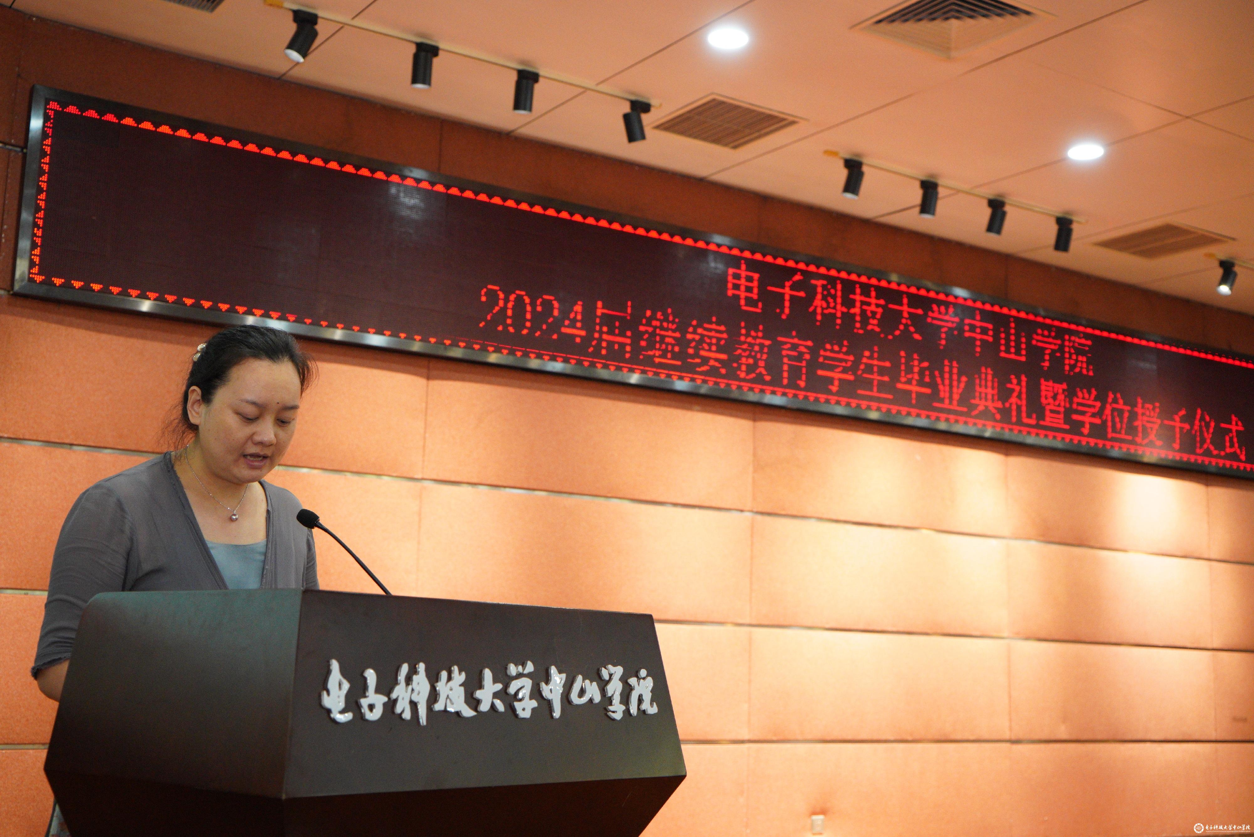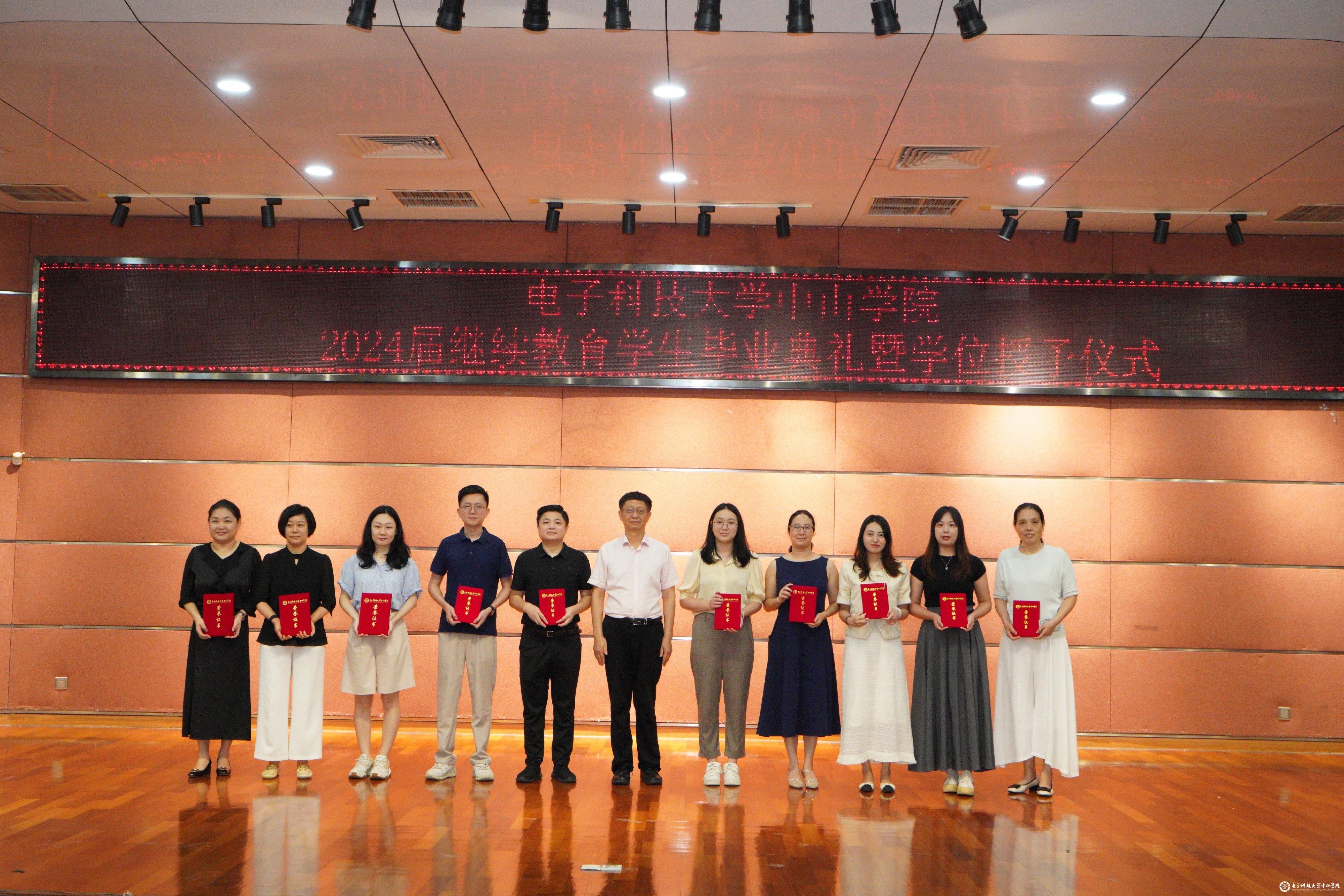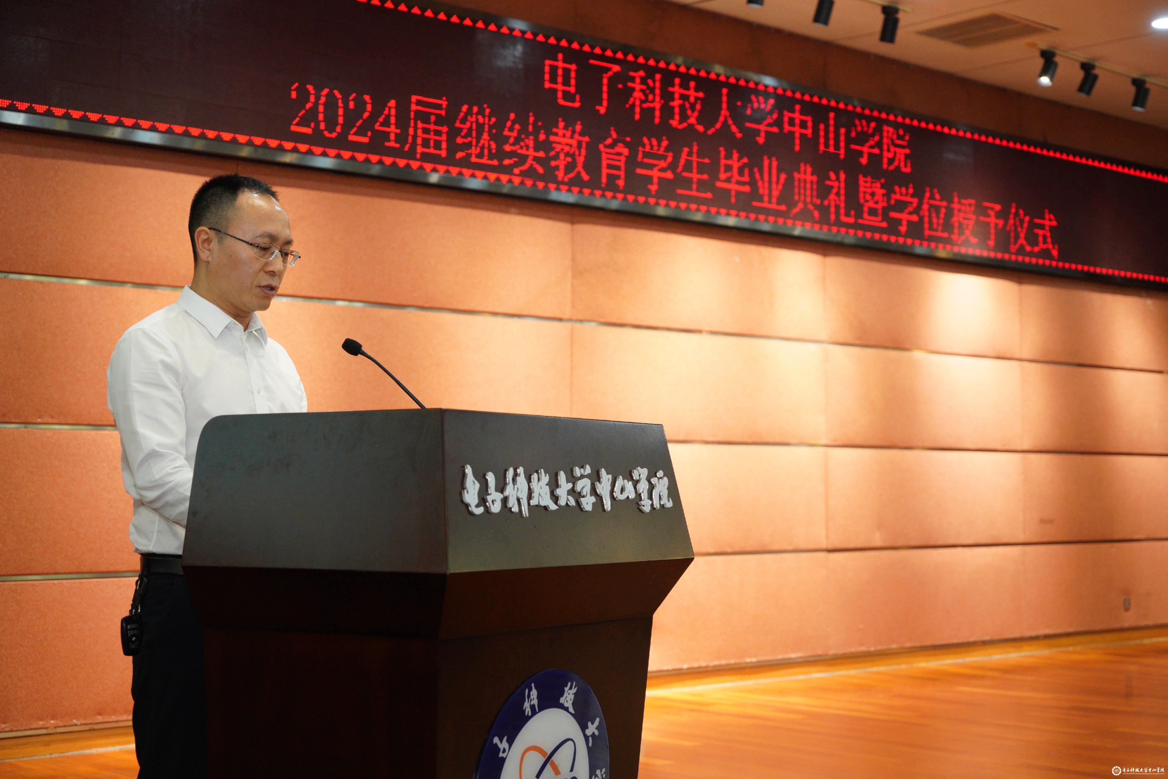 6月30日,电子科技大学中山学院2024届继续教育学生毕业典礼暨学位授予仪式在莲峰讲堂隆重举行。电子科技大学中山学院院长徐建华、3044am永利集团官网院长李牧、广州达德自学考试辅导中心校长蔡伟、深圳市上才商务培训中心校长刘海峰、珠海市外经贸专修学校校长龚艳、广东北达教育培训中心校长蒋刚苏、电子科技大学广东电子信息工程研究院副院长孙文,各教学点师生代表及家长600多人参加。本次典礼由3044am永利集团官网副院长黄智洪主持。