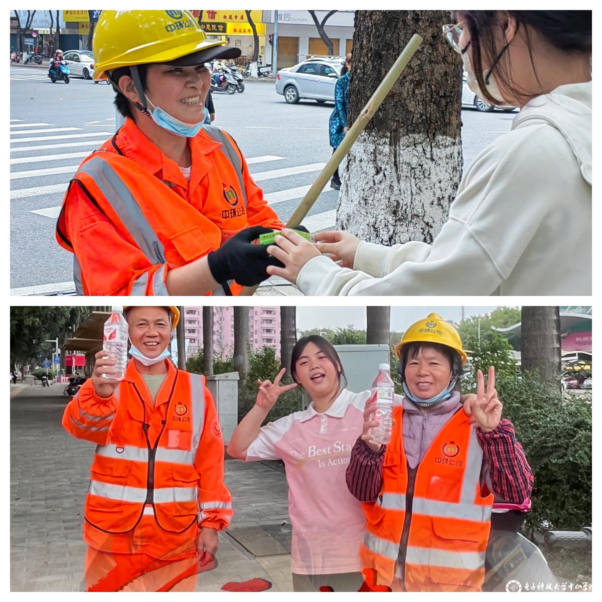 “致敬城市环境守卫者,共筑暖心美好社会”。为感谢环卫工人的辛勤付出,辅导员邓晓渝与所带班级学生开展“致敬城市美容师——情系环卫工送温暖”活动。通过慰问奋战在一线的环卫工人,对他们保持洁净城市环境而付出辛勤劳动表示敬意和感谢,并嘱咐他们劳逸结合,保重身体。